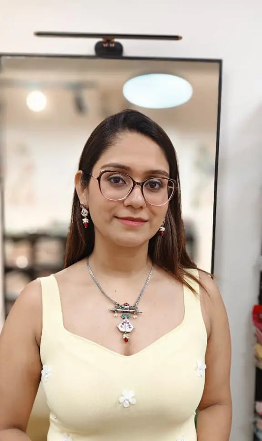 Chaandi Look oxidised Necklace With Peacock Motif and Kundan Work In Ruby Stone With Peacock Earrings