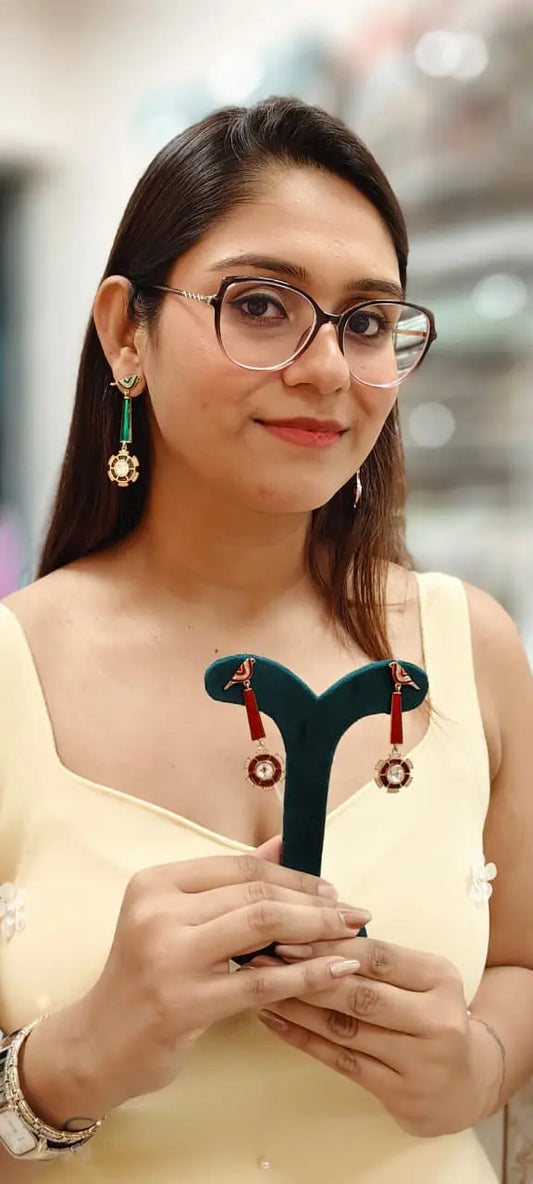 Peacock Polki Earrings with Kundan, AD Stones & Red Enamel Detailing