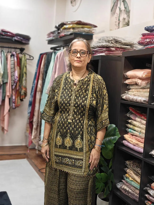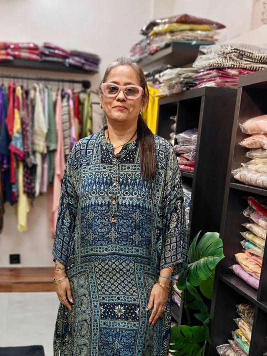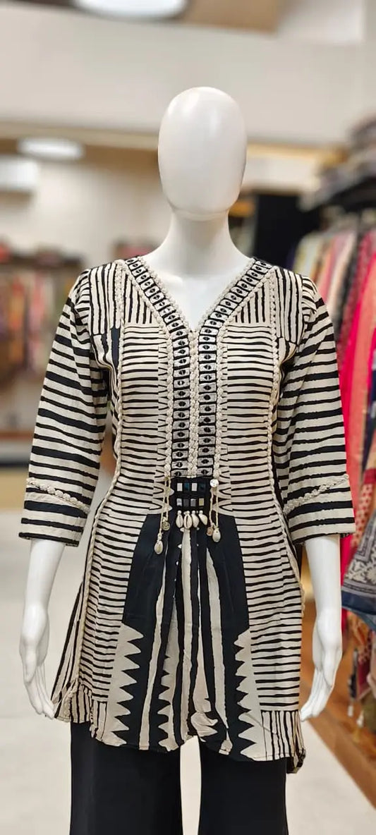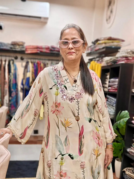 Butter Muslin Long Tunic Placement Print Co-ord Set.