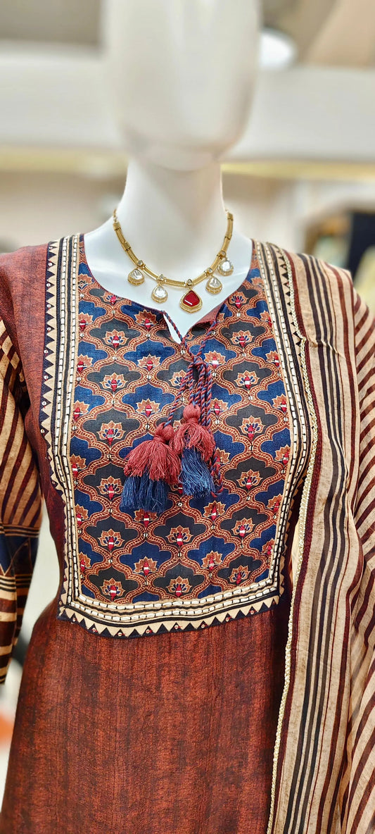 Elegant Ajrakh Print Readymade Suit Set with Dupatta