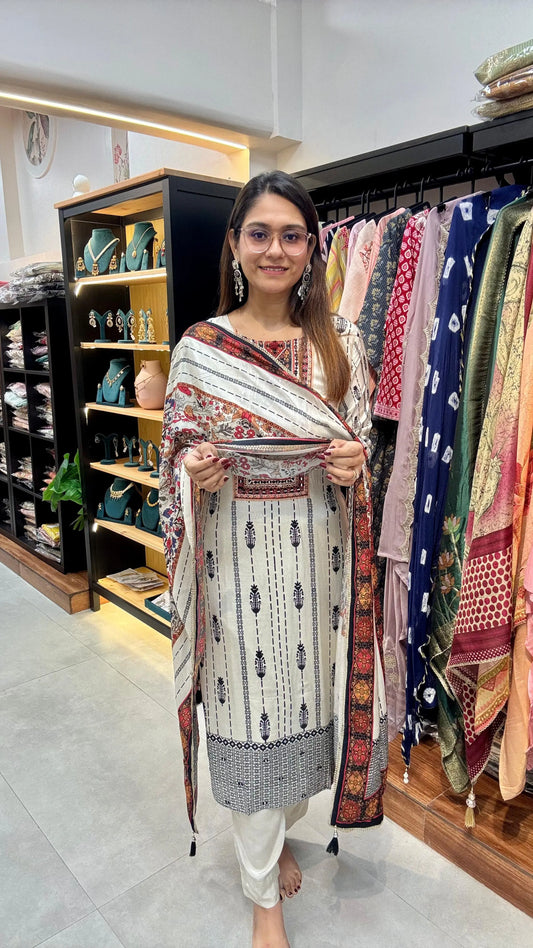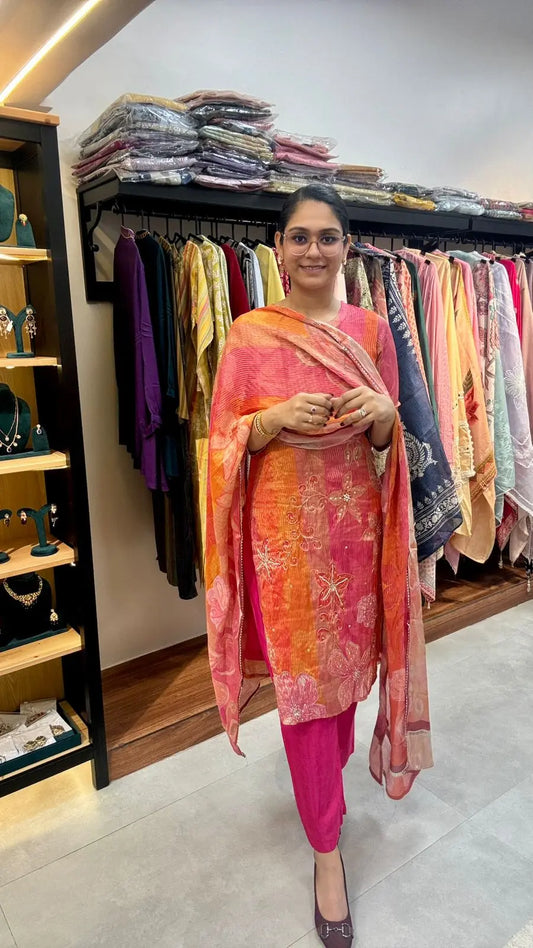 Elegant Floral Embroidered Linen Dress Material Set – Unstitched Salwar Kameez