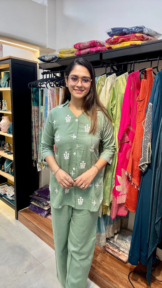 Pastel Sage Cotton Co-ord Set | Linen Embroidered Lounge Wear